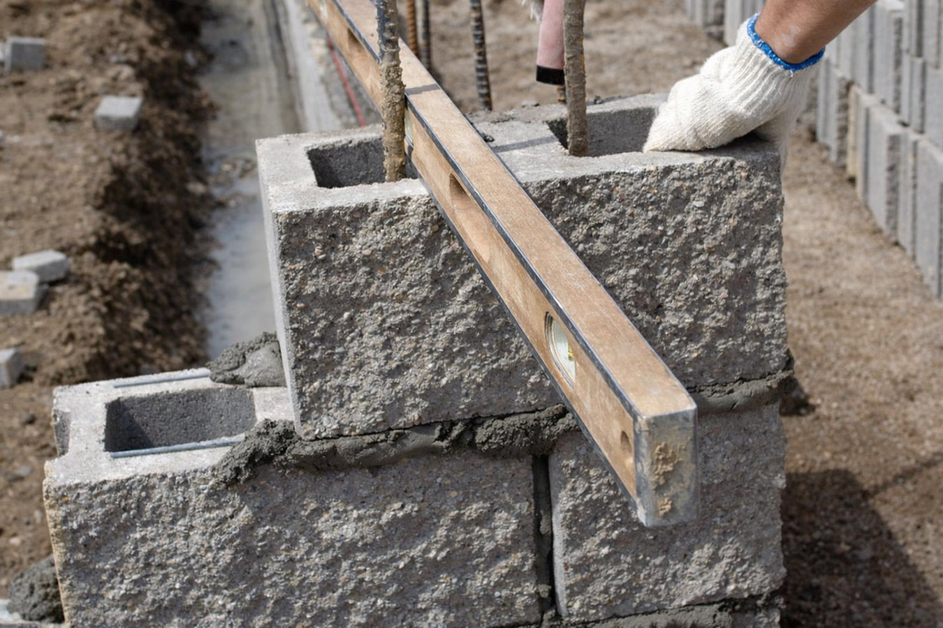 Work begins with excavation to stable soil depth and a concrete footing pour. After the footing sets, the crew lays block courses with mortar and steel reinforcement inside the cores. A city inspector visits during this phase to verify the work before it is covered.